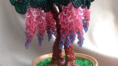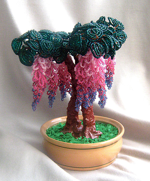 В технике бонсай выполнены чудо-деревца в горшочках. Совсем миниатюрные. Это же какая нужна тщательность для столь тонкой работы! Ствол и ветки из проволоки, за бисером ее не видать. Как художник добивается эффекта инея — загадка. Но растение как живое.