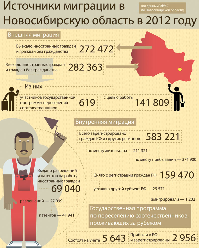 Новосибирская область отражает сибирские миграционные процессы, пожалуй, наиболее полно — по данным статистики, прирост населения за счет миграции в регионе за первые шесть месяцев 2013 года уже превысил аналогичные показатели соседей по СФО в 11 раз. Более того, по сравнению с 2012 годом поток мигрантов вырос на 30 процентов и, по прогнозам специалистов УФМС по Новосибирской области, будет расти и дальше. Большая часть наших гостей указывает цель своего визита предельно ясно и точно — работа.