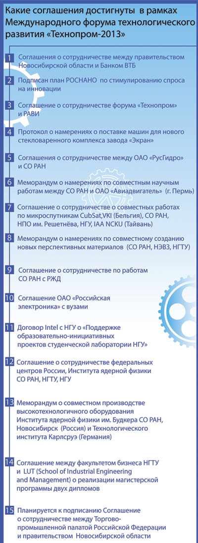 В дни работы форума был подписан ряд важных соглашений. В частности, между правительством Новосибирской области и банком ВТБ — о сотрудничестве, которое позволит поднять совместные высокотехнологичные проекты банка и области на более высокий уровень.