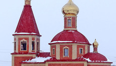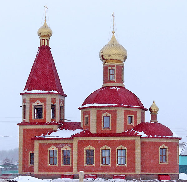 Откроется он на том самом месте, где в былые времена стояла деревянная церковь, разрушенная в 30-е годы прошлого века. Новое здание высотой 18 метров, выросшее на крутом берегу Оми, сложено из красного и желтого кирпичей. Уже подведены все коммуникации, ведутся отделочные работы.
