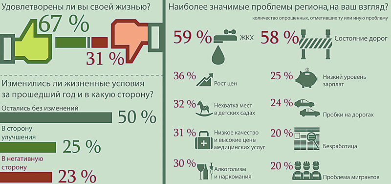 Также респонденты сетовали на рост цен (36 %) и низкое качество и высокие цены медицинских услуг (31 %). Алкоголизм и наркомания волнуют 30 % опрошенных, 25 % отметили низкий уровень зарплат, а 24 % — проблему пробок. Пятая часть опрошенных (20 %) заявила о безработице, и столько же респондентов обеспокоены проблемой мигрантов.