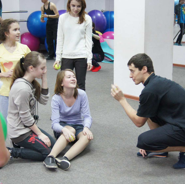 И становится ясным весь смысл происходящего. Занятия — это тренинг. А любой тренинг начинается с концентрации внимания, акцентировании его на какой-либо задаче. И легче всего этот процесс осуществляется через динамику тела — от легкой разминки к внутреннему миру артиста (его психике и духовному началу). Так ребята постигают основы актерского мастерства и сценической пластики.