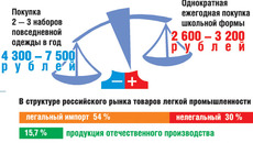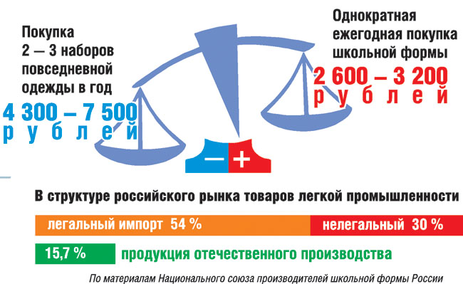 — Торговля предпочитает закупать форму из дешевых синтетических тканей, чтобы получить большую прибыль, — говорит глава Национального союза производителей школьной формы Евгений Томак. — Допустим, хорошая отечественная полушерстяная ткань для формы обходится в 500 — 600 рублей, а импортная синтетика — в 140.