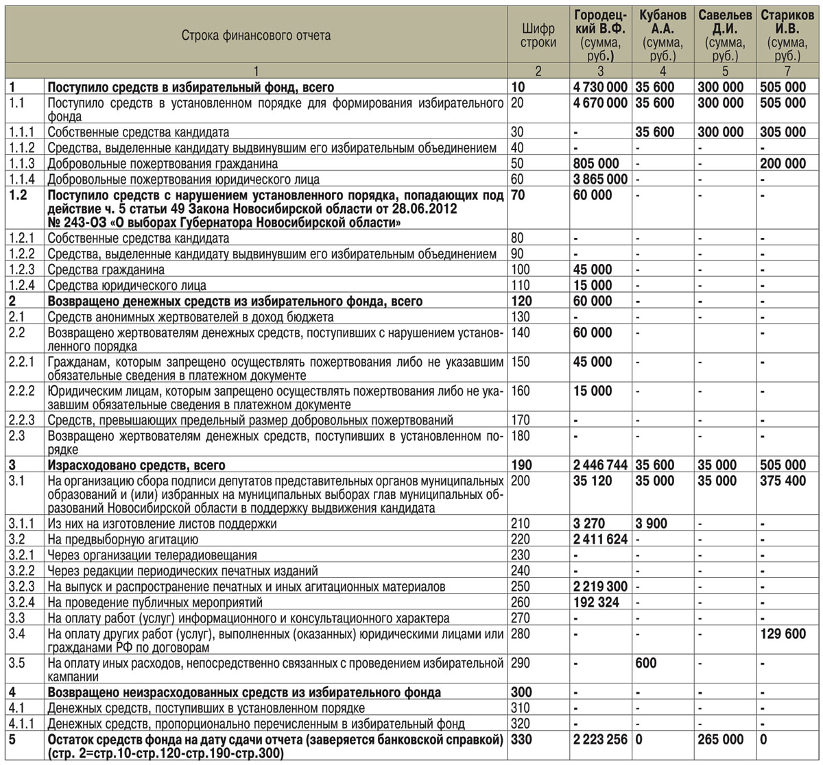 Первый финансовый отчет о поступлении и расходовании средств избирательных фондов кандидатов на должность губернатора Новосибирской области