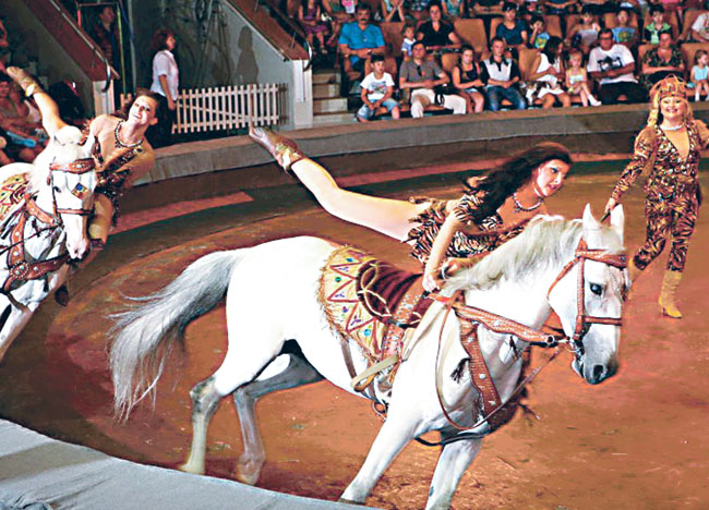 — Случаи бывали, когда впятером сядут девочки на лошадь, пятая перетягивает, и все летят на барьер, — рассказывает моя собеседница. — И падают, и ломаются — это очень сложный жанр. Порою артистки мои разденутся на пляже, а у них — огромные синяки. Я говорю — оденьтесь, не пугайте людей.