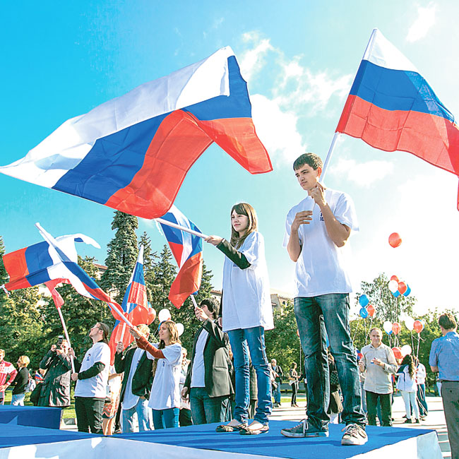 Особенно заметен был взрыв патриотических настроений во время Олимпиады в Сочи. Двести сорок волонтеров, одетые в светящиеся костюмы белого, синего и красного цветов (цветов российского флага), двигались в разные стороны, создавая впечатление, словно флаг развевается на ветру... К ним присоединились еще десятки тысяч флагов и флажков на трибунах и улицах города, да и всей страны.