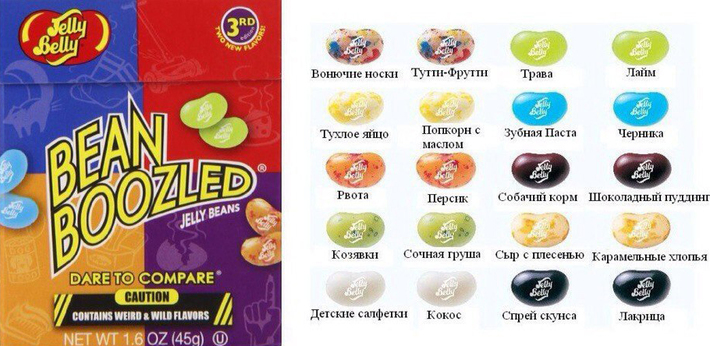 «Всего в коробочке конфет — десять различных цветов, — рассказывает Антон. — Каждый цвет может иметь один из двух возможных вкусов — приятный или неприятный. Это может быть вкус персика или рвоты, груши или соплей, тутти-фрутти или грязных носков и тому подобное. Такие конфеты подходят для развлечений в компании. Конфеты «Берти Боттс» являются одними из самых популярных сладостей в мире волшебников».
