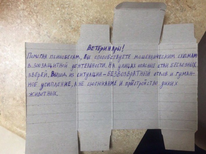 «Ветеринары! Помогая псинобесам, вы способствуете мошенничеству в зоозащитной деятельности, — заявили догхантеры в записке. — На улицах опасные стаи бесхозных зверей. Выход из ситуации - безвозвратный отлов и гуманное усыпление, а не сюсюкание и пристройство диких животных».