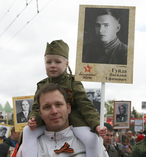 Один из первых в колонне полка — губернатор Владимир Городецкий. В его руках — портрет отца, командира артиллерийского взвода Филиппа Иосифовича Городецкого. Он прошел всю войну, дошел до Берлина. «Самое главное, что у людей есть искреннее желание прийти в этот день на центральную площадь, пронести портреты своих родных и близких и тем самым выразить уважение к победителям, героям, которые отстояли эту Победу — отмечает глава региона. — Думаю, и время для прохождения полка — вслед за парадом — было выбрано правильное. Люди идут с особым настроением, с особым состоянием души».