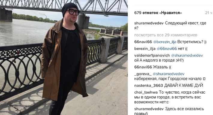 «Не поверите, первый раз лечу в Новосибирск не на гастроли, а повидаться с родными, не знаю, конечно, что день грядущий мне готовит, но буду надеяться, что накануне своего дня рождения, за долгие годы увижусь.... С МАМОЙ», — написал Шура Медведев у себя на странице в Instagram. При этом певец устроил новосибирцам настоящий квест. Он выложил несколько фото и предложил горожанам отгадать, где он находится.