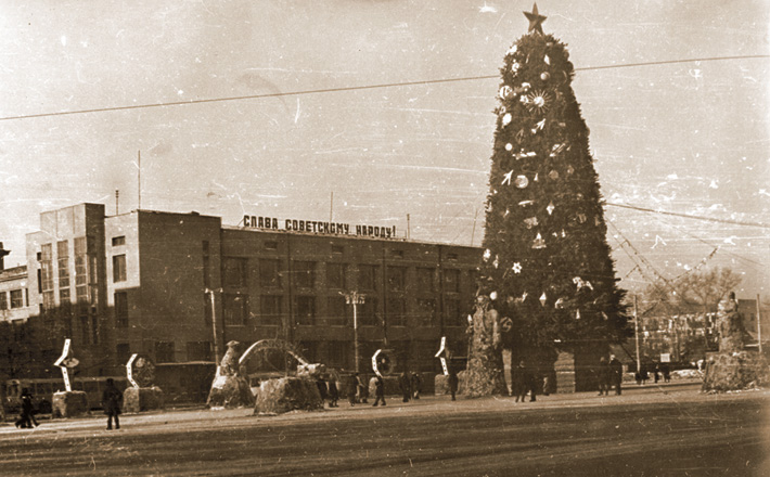 После революции празднование Нового года было отменено, и 1 января был простым рабочим днем. Только в конце 1936 года по предложению украинских коммунистов Сталин разрешил вернуть праздник. В зиму 1937 года в школах, детских садах и детских домах Новосибирска прошли первые новогодние елки. Для детей и взрослых проводили карнавалы исторических личностей, литературных и сказочных героев — Пушкина, Тараса Бульбы, Дон Кихота, Мойдодыра и других, а также обязательно героев-челюскинцев, летчиков, парашютистов. Примерно в те же годы в нашем городе наладили продажу елок населению. Первые годы новогодние деревца можно было купить только в двух местах — около театра «Красный факел» и в загородном питомнике. Елочных украшений продавали немного. Их предлагали только наборами, в которых зачастую были совсем непраздничные игрушки. Украшения стоили довольно дорого, поэтому многие люди делали их самостоятельно из бумаги, ткани, шишек. Кондитерская фабрика «Красная Сибирь» выпускала шоколадные конфеты в красивой фольге — ими тоже украшали елки.