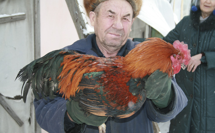 Как только он приоткрыл дверь курятника, великолепная фигура петуха напряглась. Незнакомцы все-таки. Поймать модель для фотосъемки оказалось непросто, и мы уже заподозрили, что тут не очень-то и мечтают об этом. Но все-таки люди образованные (Илья Ильич — агроном, его жена Зоя Васильевна — учительница), хотя немножко и верящие в приметы, ради общественного просвещения готовы были поступиться деревенскими принципами.