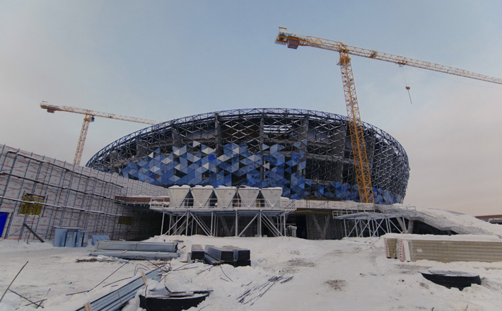 Рабочие монтируют системы отопления, вентиляции, водоснабжения и тепловой контур здания. Укладка профлиста на основной арене завершена, началось обустройство пароизоляции кровли. На малых аренах утепляют крышу, заканчивают устанавливать стеклопакеты, на тренировочной арене завершается создание ледового корта.