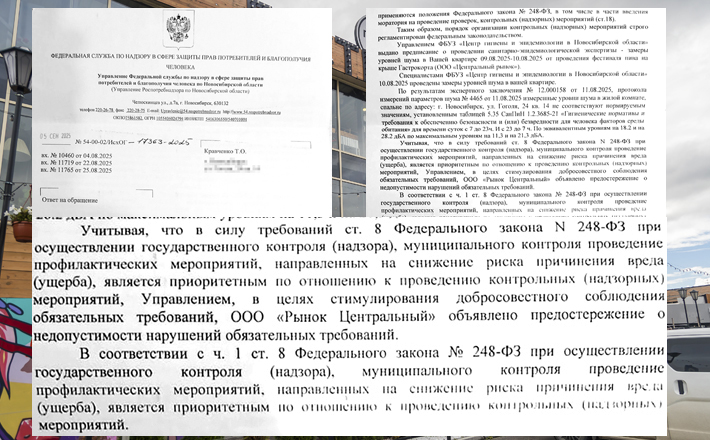 ООО «Рынок Центральный» получило предписание департамента о необходимости установить звукоизоляционное и звукопоглощающее оборудование. Еще ранее, в ноябре 2024 года, представление об устранении нарушений законодательства Центральному рынку вынесла и прокуратура Новосибирской области.