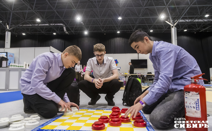 В одном из больших залов Экспоцентра, где расположились стенды учебных заведений, прямо на полу школьники играют в большие шашки. Фигурки красного и белого цвета поглощенные процессом дети двигают по импровизированной доске и совершенно не замечают происходящее вокруг.