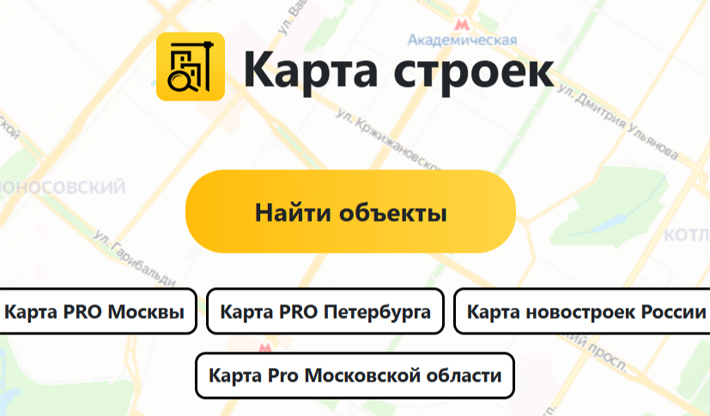 Карта — один из ключевых инструментов сервиса. На ней отображаются все строительные объекты: действующие, завершённые и запланированные. Можно посмотреть стадии строительства, исполнителей и географию проектов. Это помогает видеть общую динамику рынка в конкретном регионе.