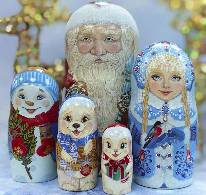 Дед Мороз, Снегурочка, снеговик, медвежонок и зайчик — пять составляющих одного целого. Новосибирская художница создала авторские матрешки, стилизованные под разные виды народной росписи.