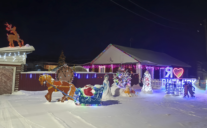 Иван и Татьяна Красновы из деревни Витинск вновь украсили свою усадьбу к Новому году — она сияла разноцветными гирляндами, там были елка, олени, Дед Мороз со Снегурочкой и другие сказочные персонажи.