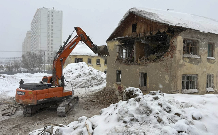 Пыль оседает на снег вместе с запахом прошлого. Очередная площадка старой застройки в Новосибирске очищается от ветхого наследия.