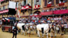 Сами скачки длятся не более полутора минут, но им предшествует бесконечная череда парадов и церемоний. Каждую лошадь-участницу предстоящих бегов обязательно ведут в церковь контрады, где ее благословляет священник. Праздник начинается с шествия одетых в средневековые одежды трубадуров и знаменосцев, несущих стяги своих контрад и бело-черные флаги Сиены. Знаменосцы состязаются в ловкости, высоко подбрасывая и ловя знамена, перепрыгивая древко и заставляя полотнища описывать замысловатые фигуры в нескольких сантиметрах от земли. Зрелище просто завораживающее. Чтобы научиться так виртуозно жонглировать флагами (это искусство называется «сбандьерата»), претенденты на участие в этом шествии тренируются годами. Праздничное шествие замыкает средневековая повозка, запряженная белыми быками. На ней везут, демонстрируя всем собравшимся, главный приз турнира — полотнище Палио. На этом торжественное, я бы сказал — облагороженное, открытие будущих состязаний завершается, и то действо, что разворачивается дальше, способен выдержать уже далеко не каждый зритель.