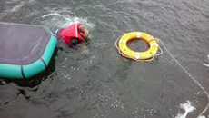 Рыбак в мгновенье оказался в холодной воде и только благодаря спасательному жилету остался на плаву.